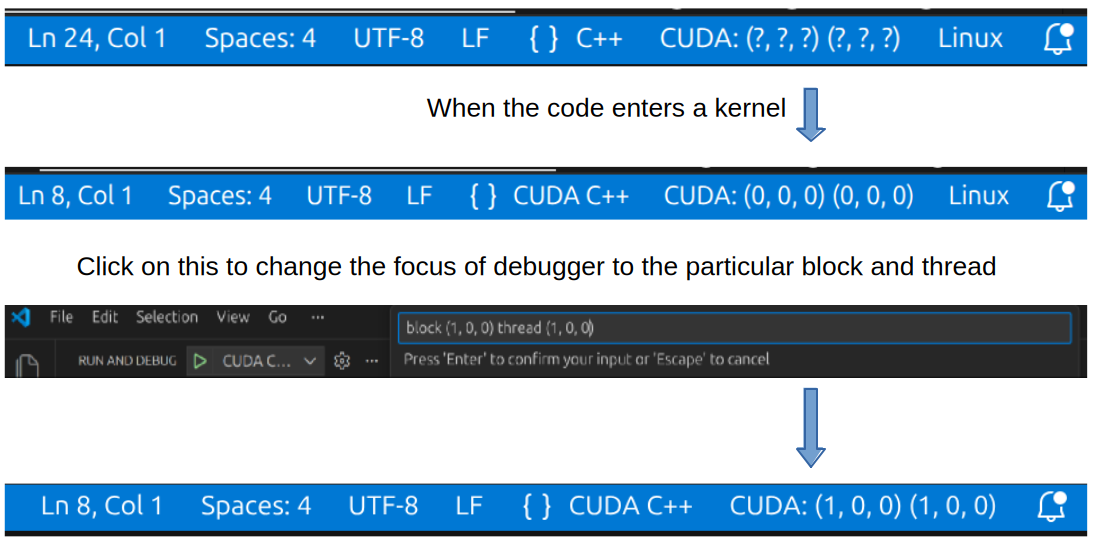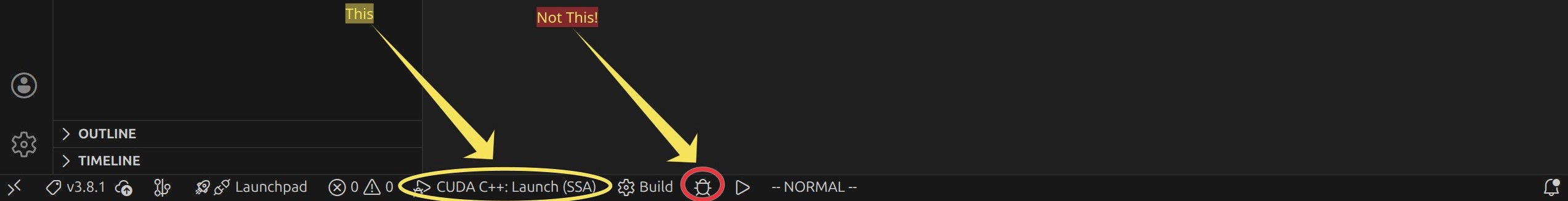 When using CMakeTools extension, we get build and debug tool icons in the bottom bar of VS Code. That debug doesn’t launch CUDA debugger. Instead, use the Select and Start Debug Configuration
